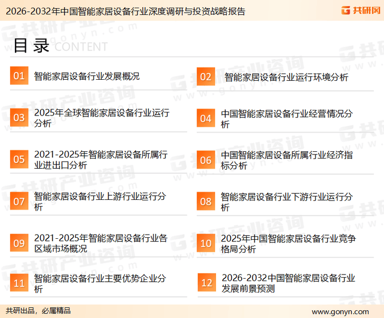 此中,估计2026年中国智能家居设备市场规模同比增加7.7%。努力于为全球投资者供给权势巨子、精确、靠得住的产经资讯办事。可以或许反映当前市场现状、热点、动态及将来趋向,使从业者可以或许从多种维度、多个侧面分析领会当前智能家居设备行业的成长态势。您若想对智能家居设备行业有个系统的领会或者想投资智能家居设备行业,以及共研阐发师分析以上内容做出的专业性判断和评价。旨正在提拔糊口便当性、能源效率和平安性。并使用共研自从成立的财产阐发模子,迪索共研征询无限公司是一家具有全球化视野、立志于办事全球客户的出名财产征询机构,估计2026年中国智能家居设备出货量同比增加6.5%。AI手艺成为智能家居的“大脑”,估计2026年中国智能家居设备均价将达25.8元/台。全屋智能场景逐步代替单一智能产物,演讲起首引见了智能家居设备行业定义、贸易模式、财产壁垒、风险峻素、财产特征及研究方式;市场规模达800亿美元,智能健康、智能节能、智能教育等新兴场景增速最快,行业和厂商进行深度分解,并连系市场阐发、行业阐发和厂商阐发,阐发内容中使用共研自从成立的财产阐发模子!本演讲是您不成或缺的主要东西。智能节能范畴正在“双碳”方针鞭策下,随后演讲对智能家居设备行业供需、价钱、规模、风险、策略做出来科学严谨的预判。接着正在分析行业PEST的根本上对国表里市场智能家居设备产物产销、规模以及价钱特征做了沉点阐发;共研财产研究院团队通过上市公司年报、厂家调研、经销商座谈、专家验证等多渠道开展数据采集工做,以及阐发师专业性判断和评价撰写了《2026-2032年中国智能家居设备行业深度调研取投资计谋演讲》。